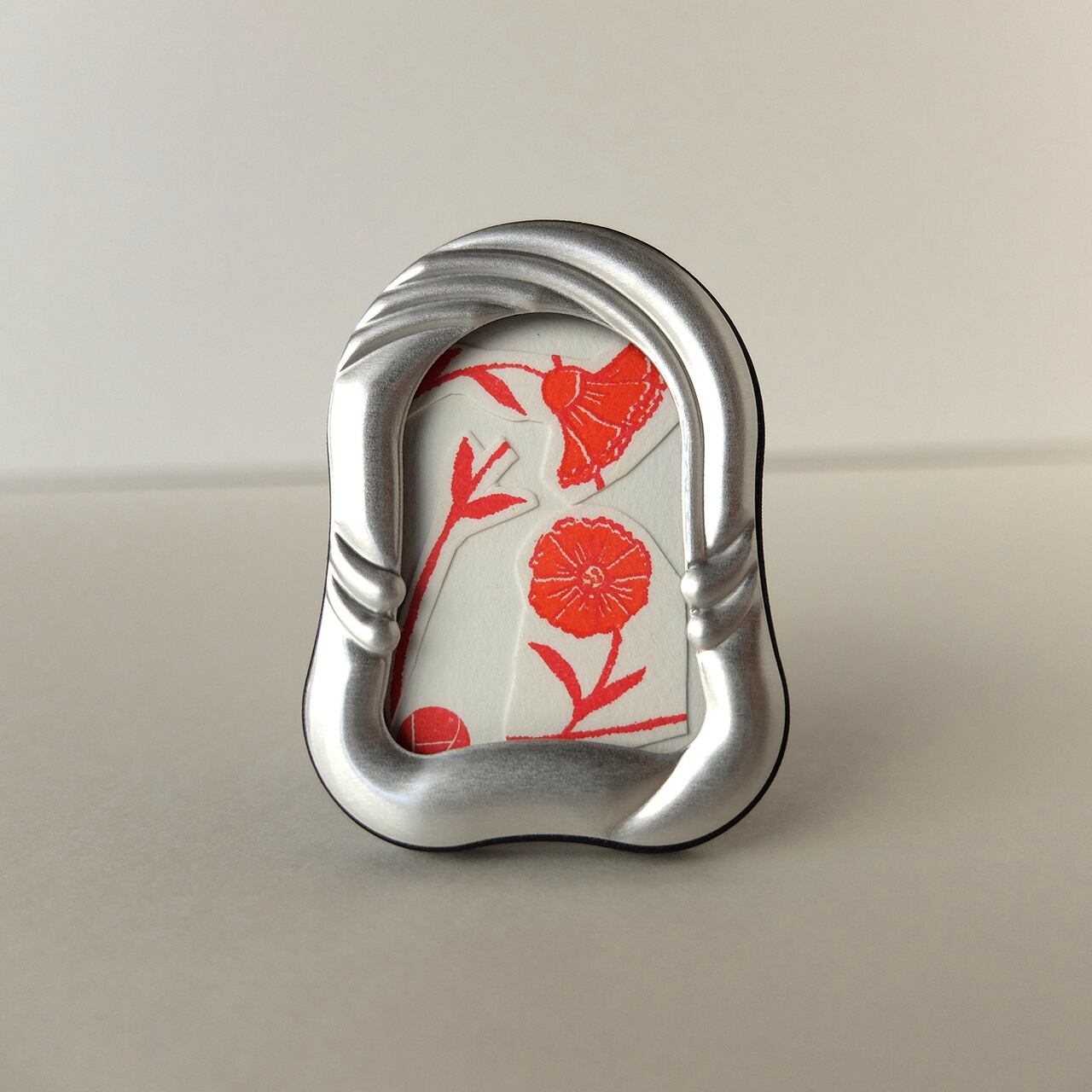 スタッフォードシャードッグのポストカードから、お花の部分だけを切り取ってコラージュした1点もののミニフレーム。花モチーフはそこにあると、文字通り場が華やぎます。エレガントで装飾的なフレームも素敵。